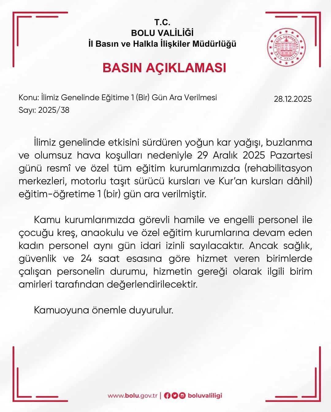 Bolu Valiliği İl Basın ve Halkla İlişkiler Müdürlüğü tarafından yapılan açıklamada, il genelinde etkisini sürdüren yoğun kar yağışı, buzlanma ve olumsuz hava koşulları nedeniyle 29 Aralık 2025 Pazartesi günü eğitime ara verildiği bildirildi.